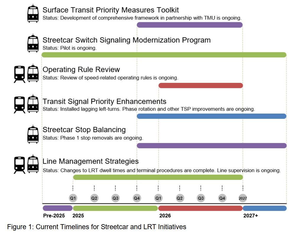 There is no discussion of the range of options that might be considered, nor is there a proposed date to report back. Obviously major change will not occur overnight, but short-term plans should explore what can be achieved within existing resources (fleet, infrastructure) and at what cost to get more out of resources the TTC already owns. Further out, no rapid transit growth will come online until the early 2030s, but the surface system should not be ignored waiting for new trains to roll into Scarborough, Richmond Hill and Thorncliffe Park.