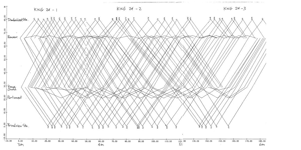 This image is explained in detail in the text, and it provides as easy way to analyze the operation of an entire route. The technique is not new, possibly only to the TTC who do not use it.