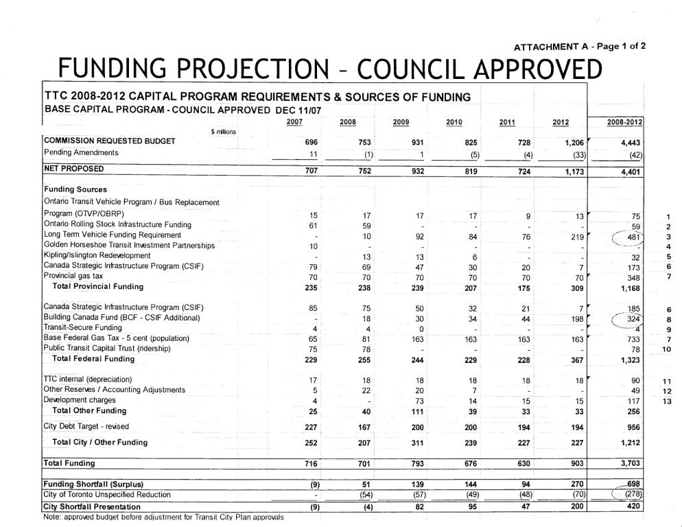 Provincial announcements made after the report was completed reduce this by $360-million to $1.143-billion, and the recently concluded agreement with Ottawa has released more funding as well. However, this still leaves a great deal to be found, and does not even touch the many “below the line” projects notably the new streetcar purchase and the SRT renovation. Funding must be in place by fall 2008 for the streetcar order to be executed with a supplier, and the SRT project requires funding by September 2009 to be started on schedule.