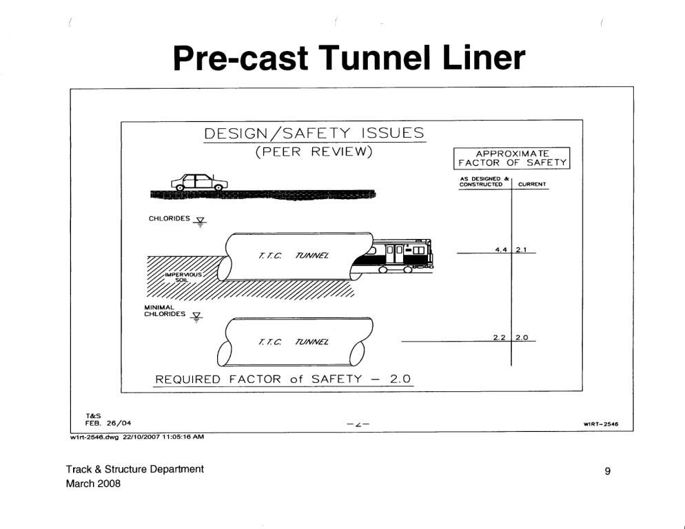 When tunnels are constructed, there is a deliberate over-safety factor built in to allow for deterioration over the life of the tunnel. However, the effects of pressure and leakage are different depending on the depth of the tunnel. Deep tunnels must withstand greater pressure, and so the safety factor “as built” is lower than shallow tunnels. However, the deep tunnels are below the transition between earth and clay (if you go down far enough, much of Toronto is a pre-glacial lakebed). The clay protects the deep tunnels from the chlorides (salts) that seep down from the road above.