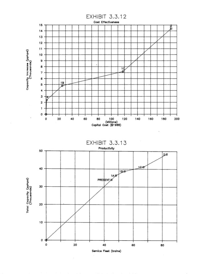 Cost effectiveness is measured as a ratio between the capacity increase and capital cost, but the absence of infrastructure and vehicle costs renders 3.3.12 questionable at best. The dip in the line for option 1C, extensive changes to the existing signal system, is cited in the text as showing that it should not be pursued because the “cost effectiveness” value does not go up as much as with the other options. Alas, we do not have a chart showing the same ratios with missing components included.