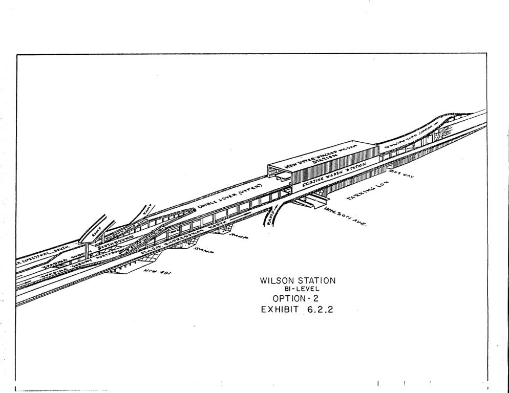 Exhibit 6.2.1 and Exhibit 6.2.2 show bi-level versions of Finch and Wilson Stations. Both of these are quite expensive, and double-deck construction is required at these locations because there is no room for new side platforms.