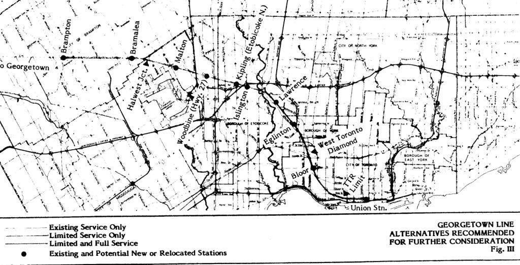 In response to the proposed Downtown Relief Line and other subway schemes, GO Transit commissioned a study of the possibilities for GO Rail service. This study recommended frequent, all-day service between Halwest (the point where the York Subdivision, CN’s Toronto bypass, meets the line to Brampton) to Doncaster (the point where the CN Bala Subdivision, used by the Richmond Hill train, crosses the York Sub).