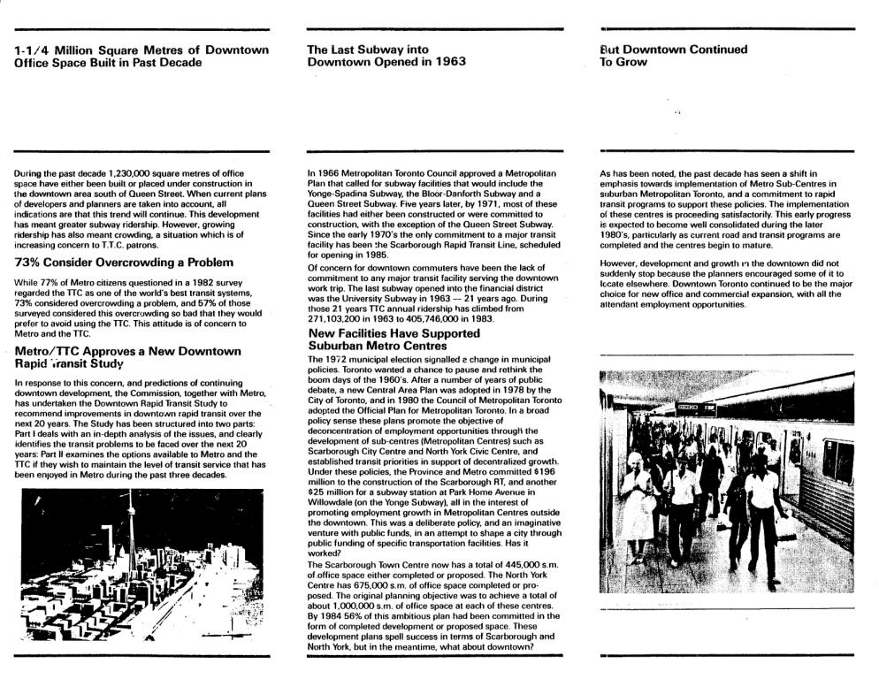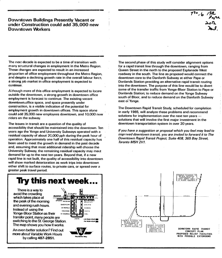 A brochure advertised this study and explained the growing problem of central area subway congestion complete with a suggestion that passengers transfer at St. George rather than Bloor-Yonge.