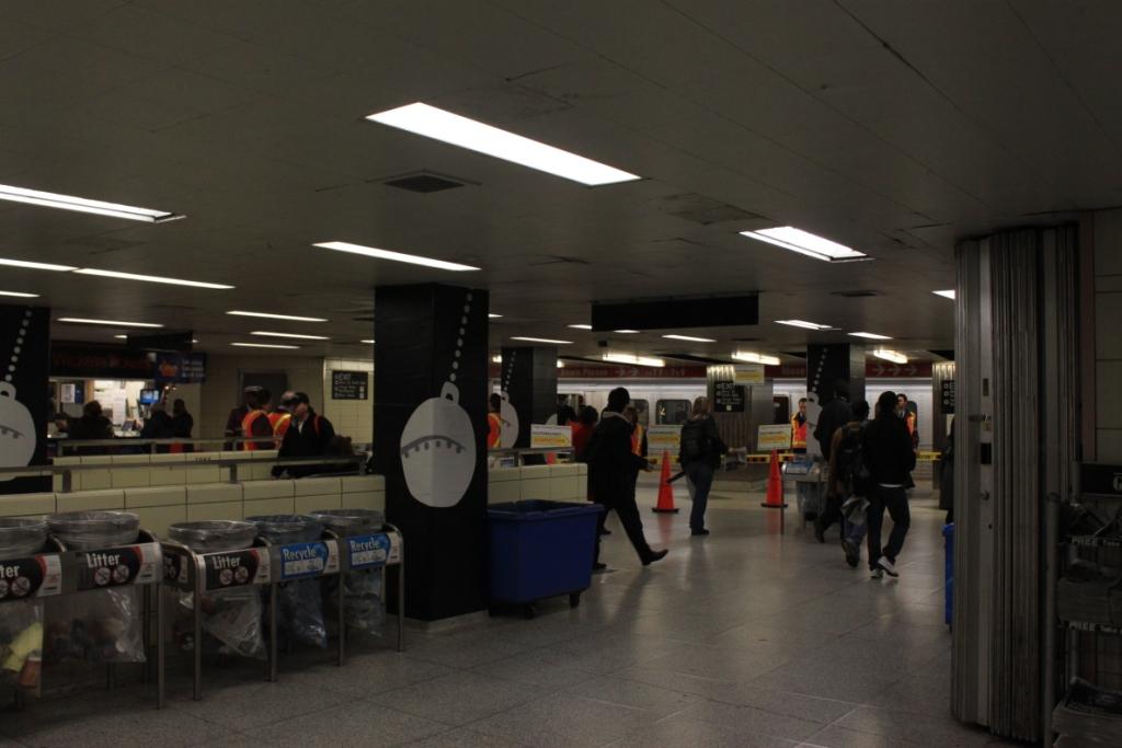 This shows the west concourse closer to the southbound platform including the temporary barriers to send transferring passengers down the side passageway.