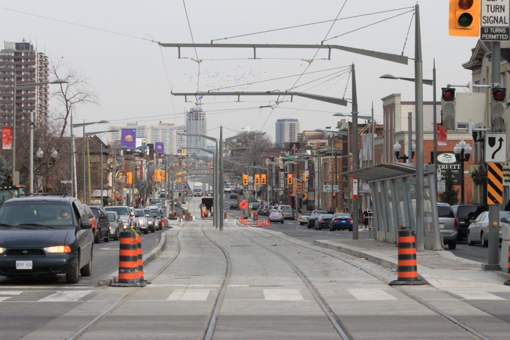 West from Yonge. The track here curves back to the middle of the road around the eastbound left turn lane.
