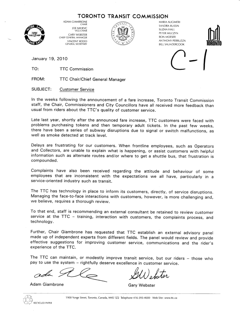 At the January 20th TTC meeting, on proposals by Chair Adam Giambrone and Commissioner Peter Milczyn, the Commission decided to seek out a “blue ribbon panel” to review customer service and improve the TTC.