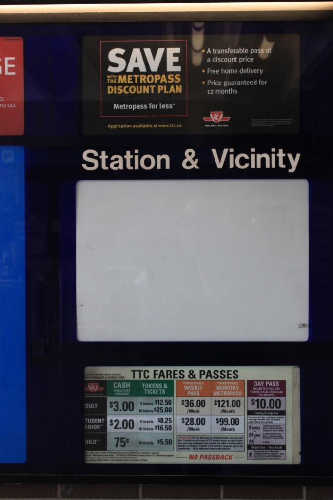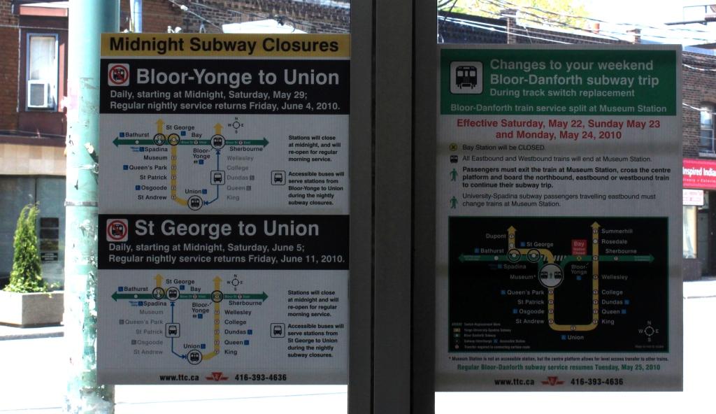 On the subject of removing and installing signs, the TTC has outdone itself in recent days. An ongoing problem is that old signs are never taken down, they just fall down, eventually, after being vandalized, shredded, or just slowly crumbling off of the wall. Last weekend, there was a subway diversion at St. George, and posters announced the temporary routing. Starting this weekend, there are nightly shutdowns of parts of the Yonge-University line. Signs for the new diversion were installed days after the St. George diversion ended, but the old signs remain in place.