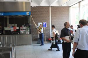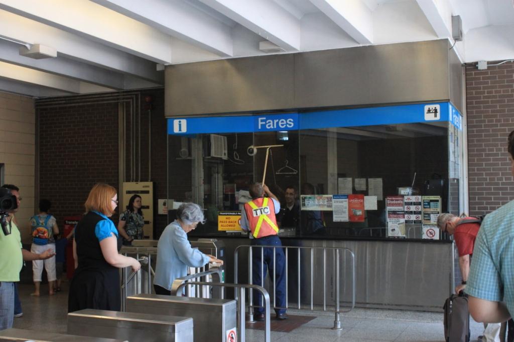 Later, we all moved inside, and things took quite an amazing turn. Strangely enough, the TTC had two workers on hand cleaning the station. I had seen one sweeping the platform when I arrived, but upstairs there was another. As Joe spoke, the cleaner was washing the glass of the Collector’s booth. I have been riding the subway since it opened, and I have never seen this activity. Maybe I just don’t frequent the right stations.