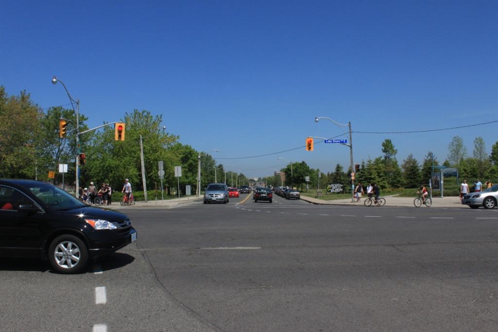 This view looks north on Coxwell from the south side of Lake Shore. Note the south-to-west turn channel — the cyclists are actually on an island separated from the southbound sidewalk by that channel. This photograph was taken on the morning of Victoria Day and shows the level of cycling activity attracted by the park.