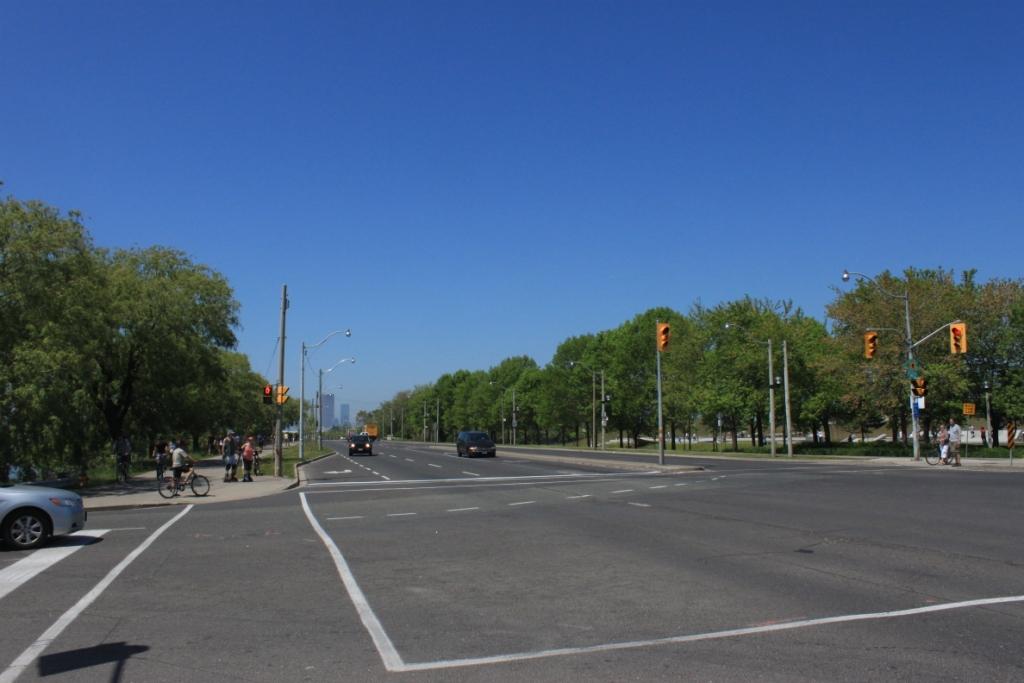 This view looks west on Lake Shore from the east side of Coxwell. The road to the left of the photo leads into the park area, and the sidewalk on the far corner is actually the continuation of the bike path from Lake Shore around and southeast into the park. Note that there are turn lanes for both east-to-north and east-to-park moves. There is also a merge lane for south-to-west turning traffic. Insertion of a two-track right-of-way for streetcars would affect intersection operations.