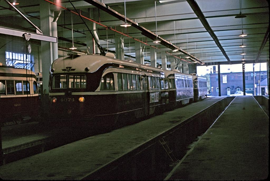Here is 4074 facing south on Track 2 inside the carhouse, nose-to-nose with another A-1 class car (identifiable by its distinctive trolley shroud) on September 21, 1965.