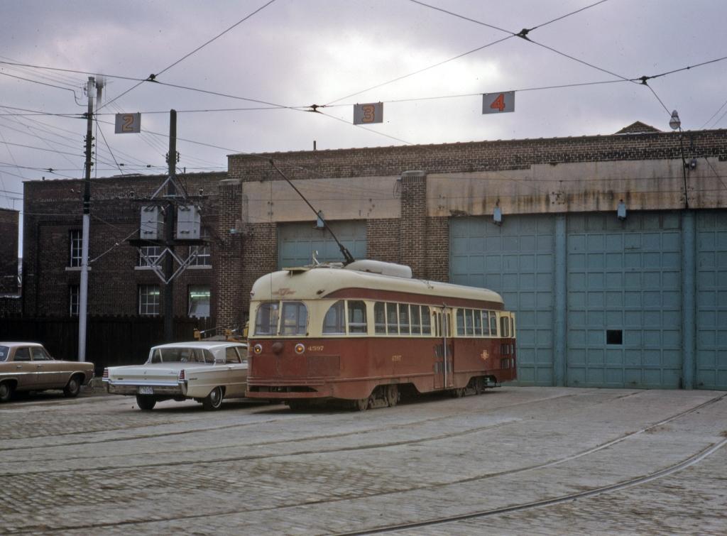 Ex-Cincinnati car 4597 sits outside of the carhouse facing south on Track 2 on December 17, 1966.