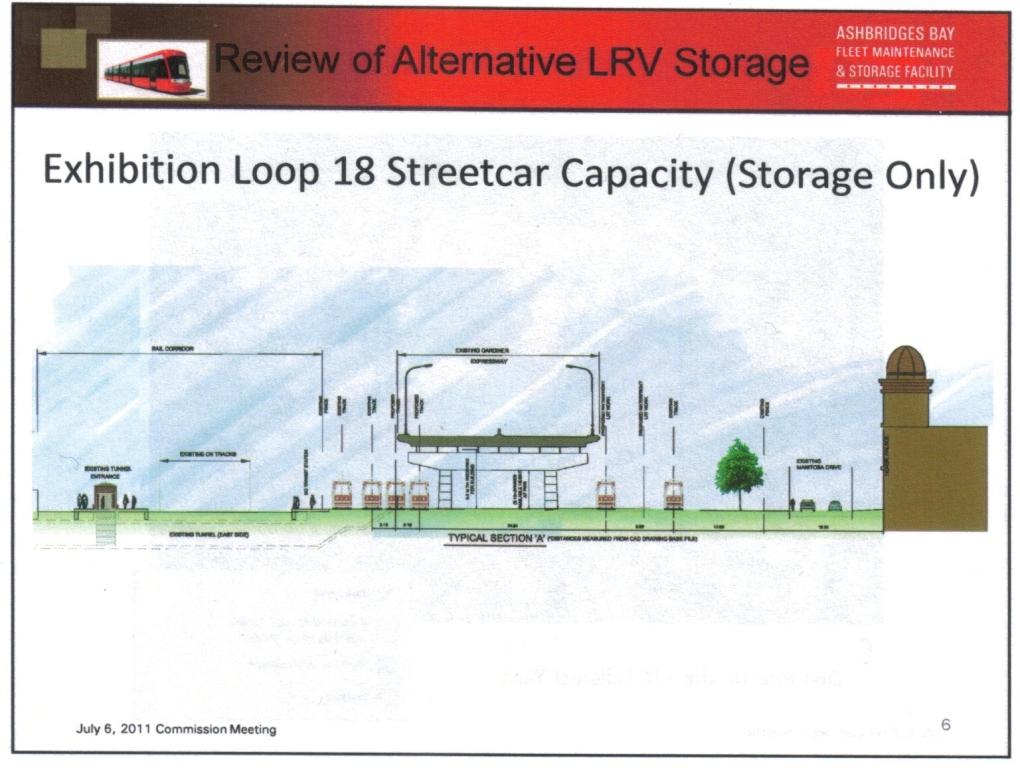 The study’s authors presented their report as an independent piece of work no longer formally associated with McMahon. The nub of their claim is that the TTC could store a substantial number of new cars at its Hillcrest and Exhibition Loop sites thereby eliminating the need for the Ashbridges project. TTC staff dismiss these proposals because (a) building under the Gardiner Expressway is not considered practical (headroom) and (b) the space available at Hillcrest is not economic.