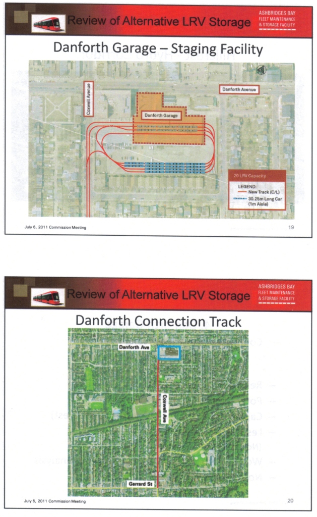 Reactivation of Danforth Garage as a carhouse was also reviewed, but this option was rejected on cost grounds. Unlike Hillcrest, Danforth is not connected to the existing network and would require a track connection on Coxwell of roughly equal length to the Leslie connection at Ashbridge.
