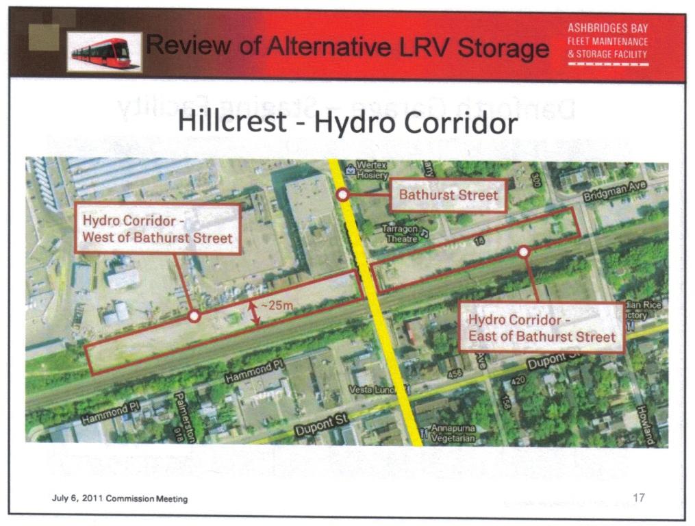 I suspect that if the TTC really wanted to, they would present at least the Hillcrest option in a more favourable light. Indeed, if the fleet of new cars expands to serve the waterfront, additional carhouse space will be required, and the Hillcrest site will be back on the table.