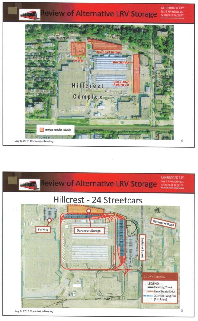 At Hillcrest, 24 cars could be stored and serviced using land in the existing parking lot and Davenport Garage (see diagram in the report). Although this would reduce the capacity required at Ashbridge and shorten dead-head times for some routes, the TTC argues that the life cycle cost for this arrangement would still be considerably higher than concentrating the fleet at Ashbridge.