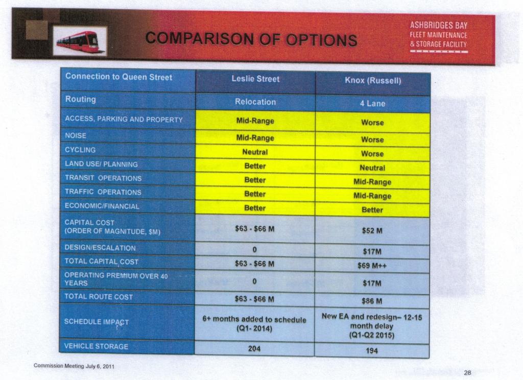 The TTC focuses on the alleged shortcomings of the Knox alternative, but does not present the offsetting benefits of staying off of Leslie Street. Community and traffic effects, both during construction and for eventual operation, have never been contrasted. Whatever benefits there may be by leaving Leslie Street “as is”, these are never shown as part of the overall evaluation.