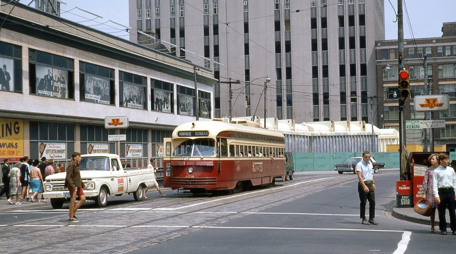 Published December 31, 2014 at 1727 × 962 in A Look Back: Dundas Cars Near City Hall ← Previous Next → Yonge and Dundas looking E The demolition in the background had been the site of O’Keefe’s brewery (hence the name “O’Keefe Lane”), and the Brown Derby tavern sat where the AMC complex is today.