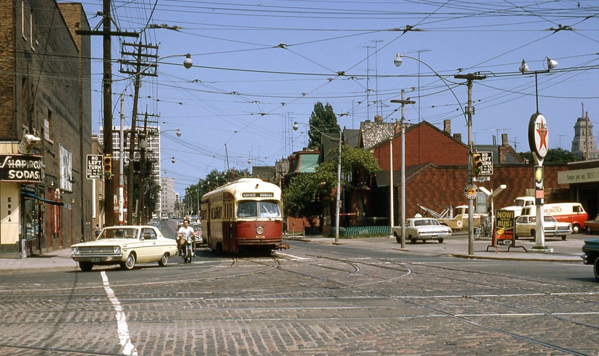 August 1967. The building on the northeast corner was, at that time, the Victory Burlesque. Many of the houses along Dundas still exist, but they have been converted to shops in what would become “Chinatown 2″ as the original area around City Hall was pushed westward. Many more were demolished for new buildings.