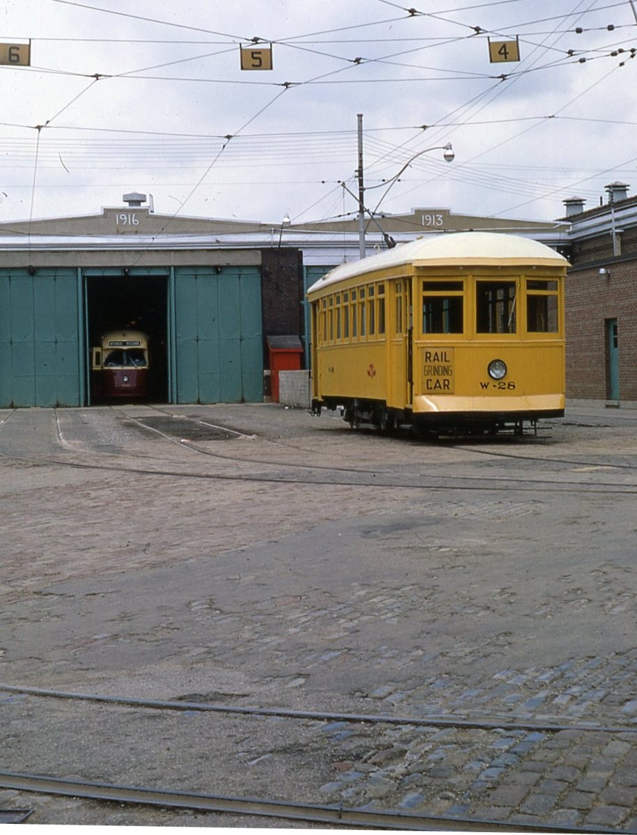 Published December 31, 2014 at 1140 × 1495 in A Look Back: Rail Grinder W28 ← Previous Next → St. Clair Carhouse At a still-active St. Clair Carhouse, years before Artscape got its hands on the property. A Rogers car peeks out of the open door.
