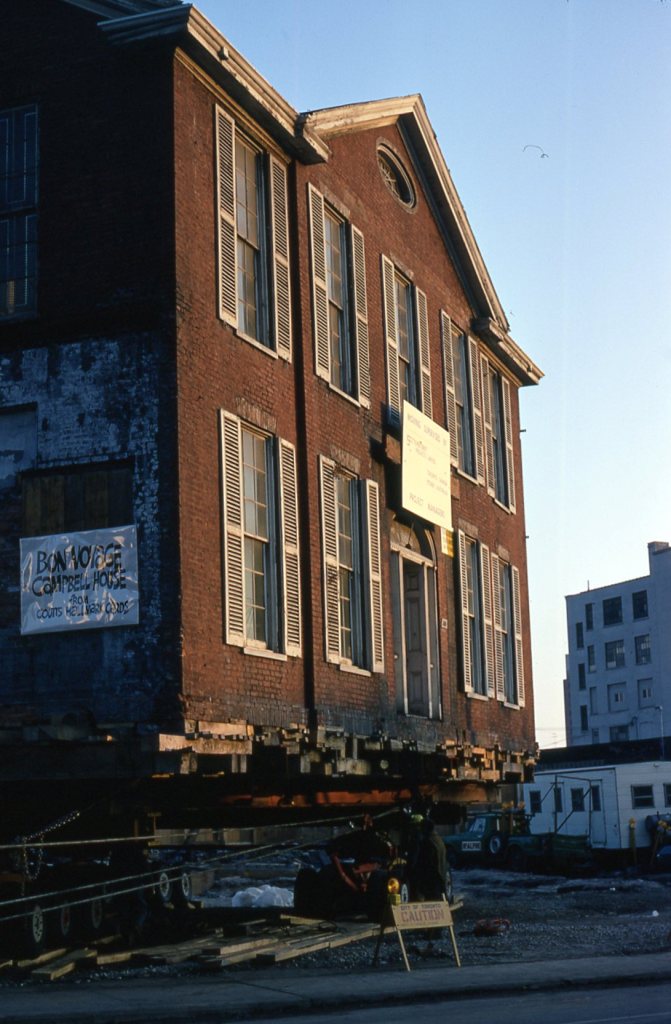 Campbell House sits on its original site, but already it has been jacked up from its foundation onto a set of dollies and rotated so that it is ready to begin its journey out onto Adelaide Street. The “Bon Voyage” card on the wall is from Hallmark Cards, owners of the site, who wanted to expand their parking lot.