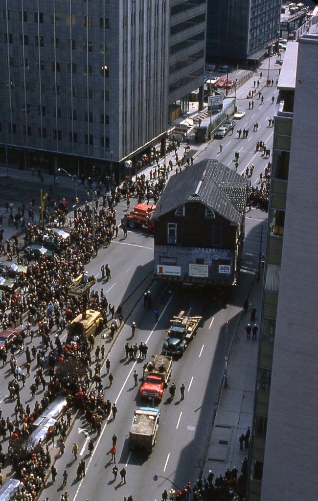 Campbell House crosses Yonge Street. The subway stopped running as the house rolled above lest the combination of vibrations and the weight of the building led to disaster for the subway or the house.