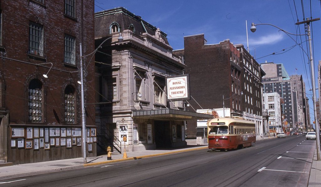 Looking east on King at the Royal Alexandra Theatre then recently refurbished and reopened by the Mirvish family. Ed’s Warhouse Restaurant (with many plates in the windows) is just west of the theatre. Out of frame on the right is the CP Express building where Thomson Hall now stands. Notable by their absence are the office towers of King and Bay.