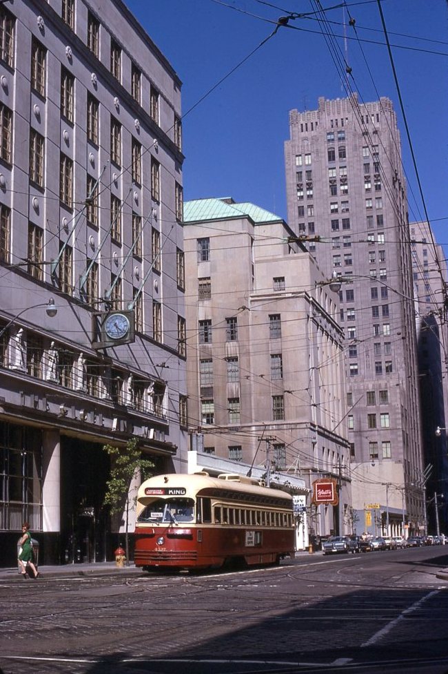 Looking east at King and York beside the Globe & Mail building. Parts of its facade were preserved in the “new” Globe building at Front & Spadina, a building from which the Globe is about to decamp once their new offices go up on the eastern part of their Front Street site. Much of what once stood on King Street (some already demolished in this photo) has vanished under gleaming new towers. The gleam on the BMO tower was not quite so bright as hoped, and its original stone cladding was replaced quite recently (final work at ground level is in progress).