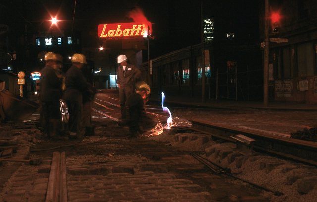 Published December 25, 2012 at 640 × 408 in Looking Back: Toronto By Night I ← Previous Next → King and Parliament Removing the special work at King and Parliament leading to Parliament Loop (now the site of an auto salesroom). July 1969.