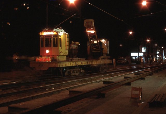 When the TTC still welded its rails into strings (a practice discontinued from about 1970 until the 1990s), the sections would be laid out in the curb lane of a street for thermite welding by the day shift. The night crews would come later to change out the old running rails for the new track.