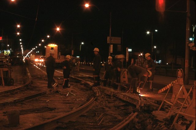 Published December 25, 2012 at 640 × 427 in Looking Back: Toronto By Night I ← Previous Next → Church and Wellington looking N Removing the special work at Church and Front/Wellington. July 1970.