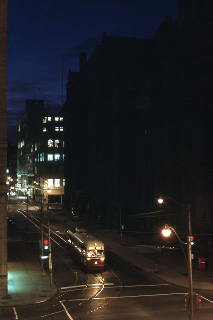 Published December 25, 2012 at 425 × 640 in Looking Back: Toronto By Night I ← Previous Next → City Hall Loop 4551 in City Hall Loop westbound on Albert at Bay seen from the walkway around New City Hall. A vestigial reminder of the track that once ran through the City Hall site is visible just in front of the car.