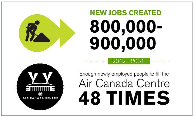 The statement here is that “enough newly employed people” would fill the ACC 48 times. The official capacity of the ACC is 19,800, and so we’re talking about 950,400 newly employed people. That’s roughly 1/3 of the entire population of Toronto.