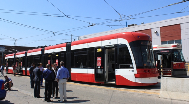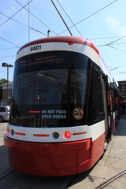 Today the TTC took the media on a short excursion with its new streetcar, 4401, from Hillcrest Yard to Bathurst Station and return. I spent a good deal of the trip being interviewed by others, and so my photo coverage is limited. However, over on the Torontoist site, there are lots.