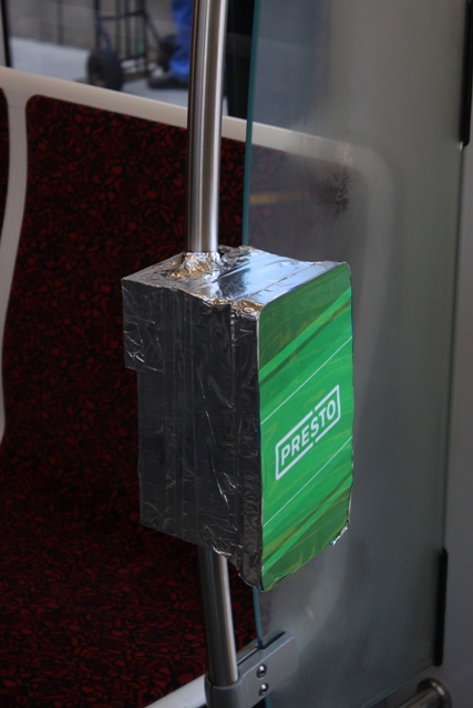 In the two central vestibules there will be Presto card readers. Here, a mocked up box with duct tape stands in for the final product to give a sense of size and placement. During the transitional period to full Presto use on the TTC, these machines will issue a fare receipt to that riders can transfer to other non-Presto routes. Riders with other fare media will use machines at major stops or onboard to pay their fare and get a receipt. Metropass holders will simply board and show their passes if challenged by a roving fare inspector.