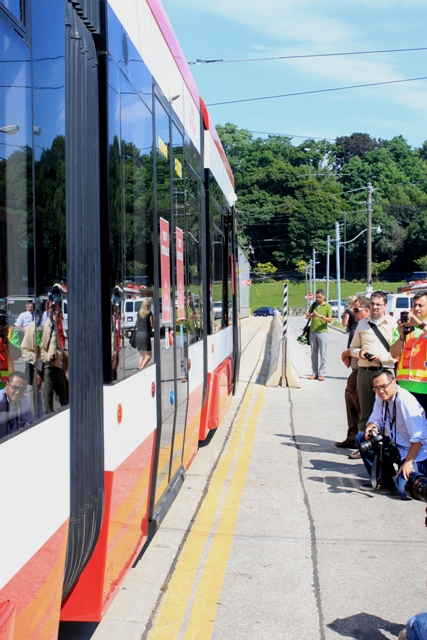 I know the plan is to send these ones back to get them fixed up, and then we wait for a full route worth and then make the switch … but not having a few runs in rush hour with a full load seems pretty risky to me, we found issues with the subways that only showed up during real life … ie people accidentally hitting the alarm, and doors not being as quick as expected … why would we not run at least one train on a suicide mission on King or Spadina for the summer and winter during rush hour – free boarding seems only fair since they don’t have presto yet 😉 – if I was TTC I would be running a twitter competition, putting some big speakers on it and driving it in loops around city hall blasting TTC Skiddadler, then training it up with a PCC and having it run service during the Ex … followed by Steve hosting a star studded gala aboard one during TIFF 🙂
