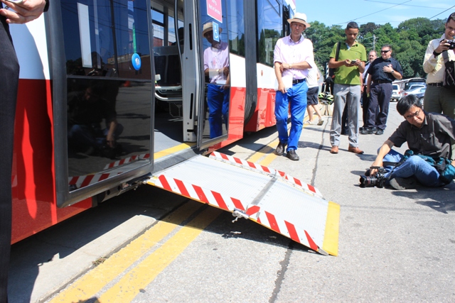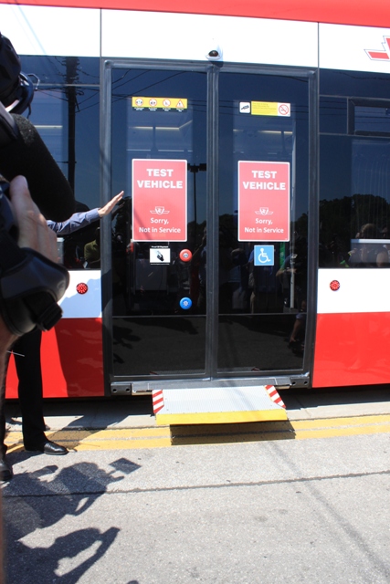 From the side, the ramp at full deployment, with, yes, more media including the National Post’s Peter Kuitenbrouwer artfully reflected in the car door. The blue button on the door panel is used by riders to request a ramp deployment from the street. A matching button is found inside (see later photo).