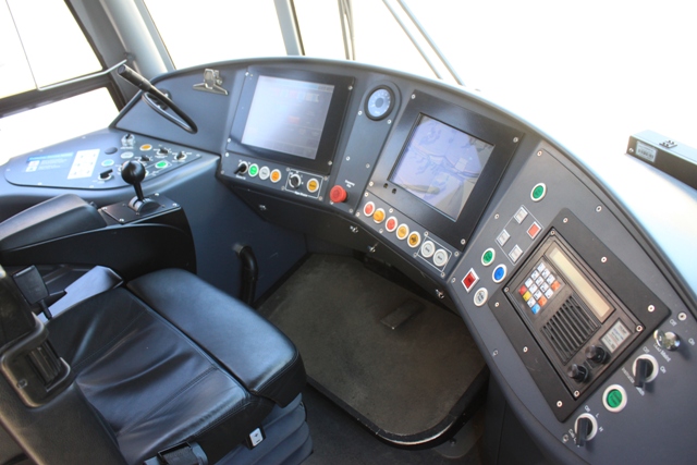 Here is the operator’s console. The controller handle is on the left of the seat, and the dashboard beyond contains switches for functions that would not be engaged while the car is in motion (emergency cutouts, for example). Two video screens show system status (left) and the video monitors from various points inside and outside of the car. The right hand panel includes all of the passenger-related functions. The two white buttons activate the gong (synthetic) and the horn (very loud).
