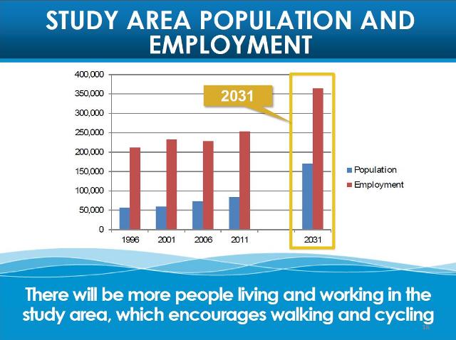 Between 2011 and 2031, population and employment in the area under study will grow dramatically with population more than doubling and employment growing by more than 50% [page 18].