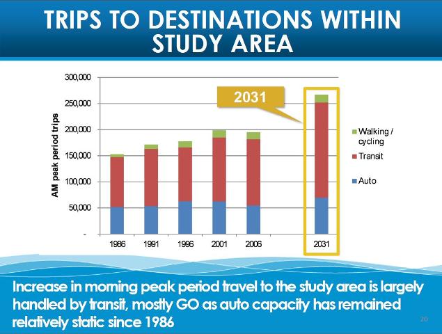 Trips into the core are expected to increase by over 25% with the lion’s share projected to be on GO Transit [page 20].
