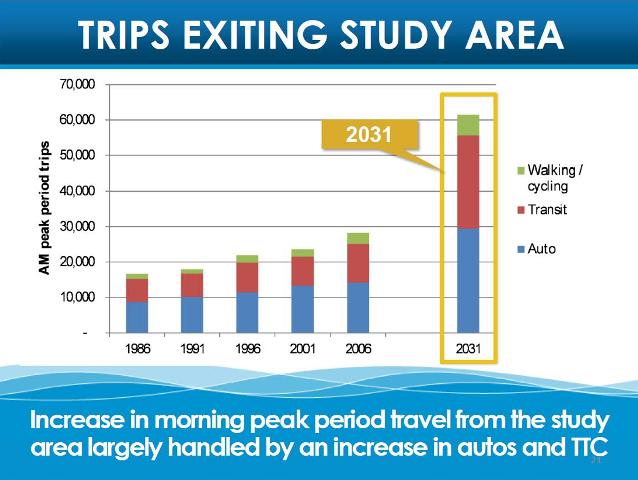 Population in this area is already rising very quickly at a rate far greater than transportation facilities can keep up. This growing downtown population contributes to a rise mainly in local transit trips by 2031 with smaller increases in auto and walking/cycling. [page 19]