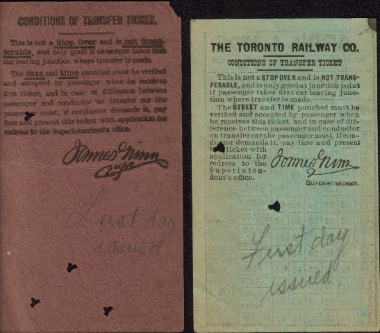 The text on the back of the transfers will sound familiar to TTC riders today, and it sets out the conditions of use. Note that the writing on the transfers was there when I got them and probably dates from when they were culled by someone in the TRC for the collection.
