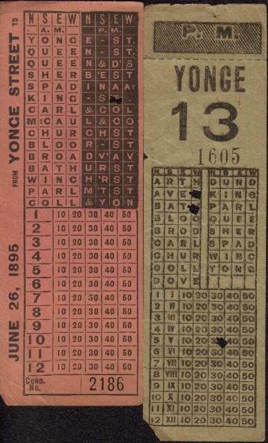 This pair dates from 1895 and 1905 respectively (I am missing any sample of an interim 1898 version that shifted the route name and date to the top of the transfer). The “P.M.” tearoff strip makes its first appearance in the 1905 transfer. Years later, the TTC would change this to “Night” when the hours took the modern form running from 5am to 5pm.