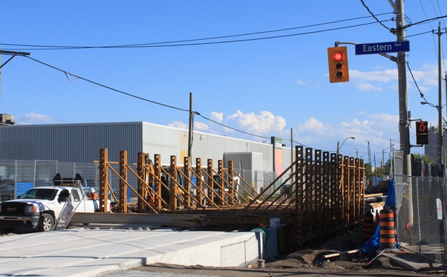 Looking south from Eastern Avenue. The track will be laid in a form (see also the next photo) whose design is intended to distribute the load across the street and avoid problems with poor soil conditions below. The form shown here moves on small rails.