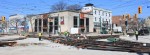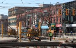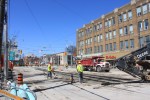 Saturday, April 18: Concrete work around the tracks is substantially complete, and some pedestrian paths through the intersection have been shifted onto the pavement to allow work to begin on sidewalk and curb repairs.