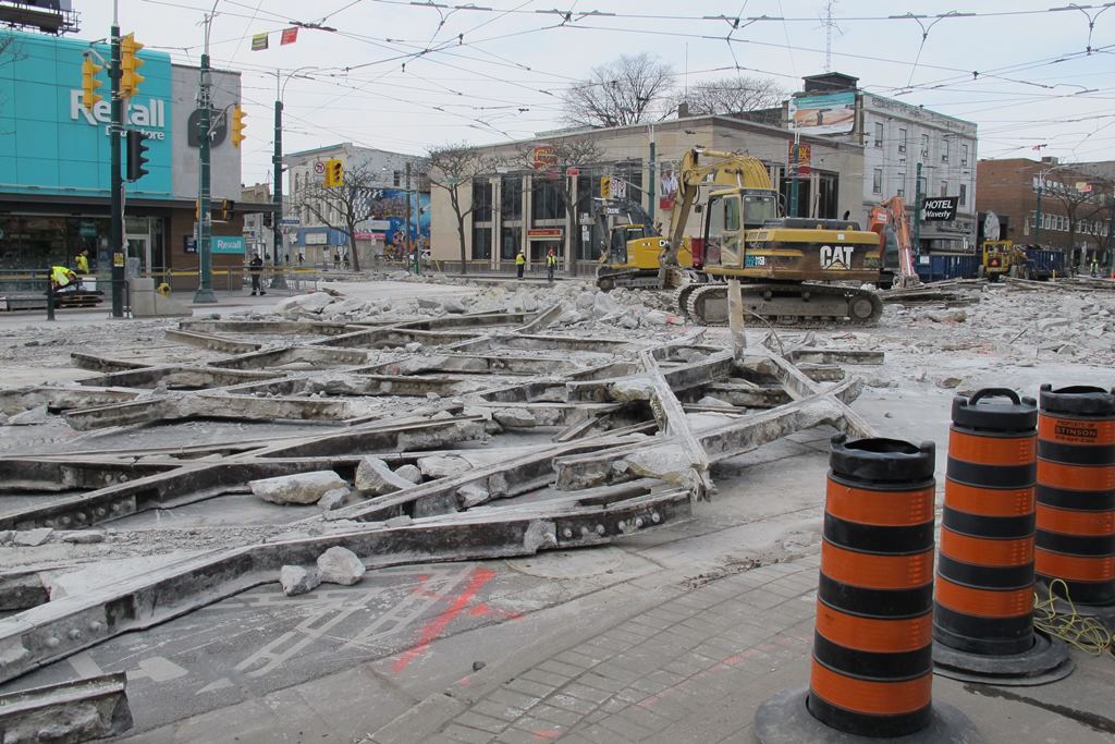 Published April 10, 2015 at 1024 × 683 in College & Spadina Reconstruction (Updated May 8, 2015) ← Previous Next → April 7: Old track on the SE corner of College & Spadina (H. McMann photo) Apr 07, 2015/Toronto, ON: TTC. TTC. Spadina & College intersection. L/NW at rail replacement construction.
