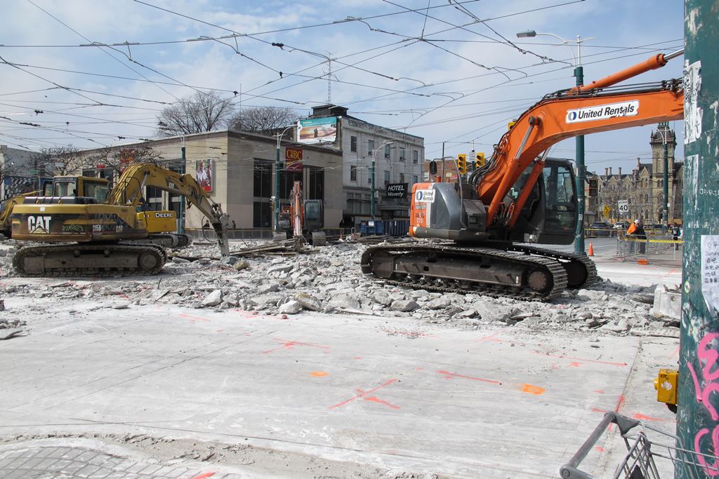 Published April 10, 2015 at 1024 × 683 in College & Spadina Reconstruction (Updated May 8, 2015) ← Previous Next → April 7: Looking NW across College & Spadina (H. McMann photo) Apr 07, 2015/Toronto, ON: TTC. TTC. Spadina & College intersection. L/NW at rail replacement construction.