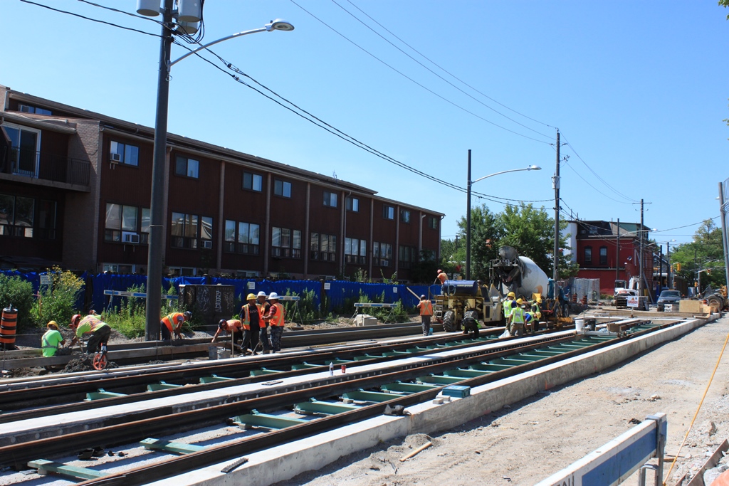 IMG_6022w Published July 16, 2015 at 1024 × 683 in Another Delay For Leslie Street (Updated August 7, 2015) ← Previous Next → July 16/15: Looking N toward Queen (Re-)laying new track and beginning sidewalk construction