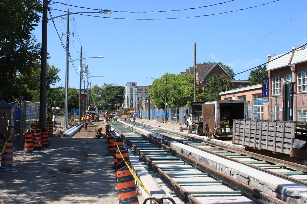 IMG_6024w Published July 16, 2015 at 1024 × 683 in Another Delay For Leslie Street (Updated August 7, 2015) ← Previous Next → July 16/15: Looking N to Queen from Eastern Track substantially in place. Sidewalk reconstruction started.